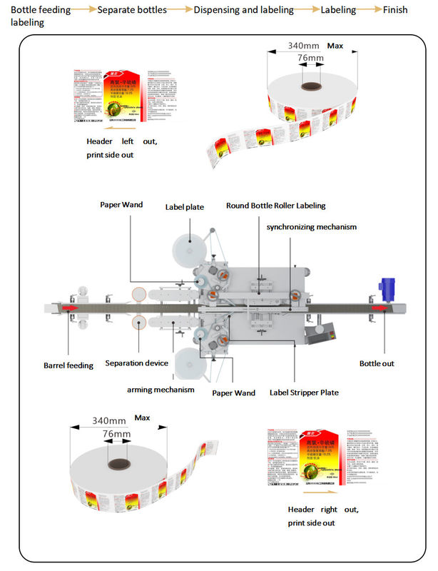 Fotoelektrik algılama, PLC kontrolü, dokunmatik ekran yazılımı kullanımı, taşıma, şişeyi destekleme, şişe kademesiz hız ayarı, standardı doğru bir şekilde yapıştırma; aynı zamanda etiketleme yapmama, etiketleme yapmama otomatik düzeltme, otomatik algılama ve diğer işlevlere sahiptir.